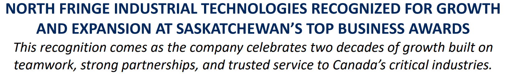 Nipawin, SK (September 29, 2025) – North Fringe Industrial Technologies Inc. is proud to announce it received the Growth & Expansion (Small Business) Award at the Saskatchewan Chamber of Commerce ABEX Awards, presented Conexus Credit Union and sponsored by PFM Capital Inc. The Growth & Expansion Award recognizes small businesses with fewer than 50 employees that have achieved significant growth through strategic initiatives, expanded services, or new market development.